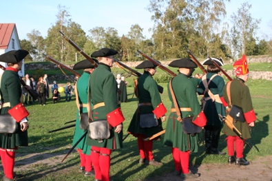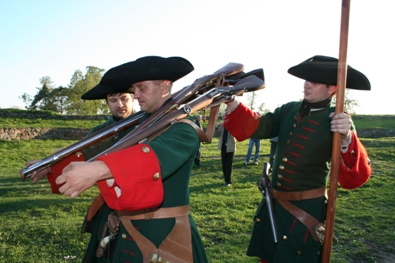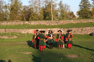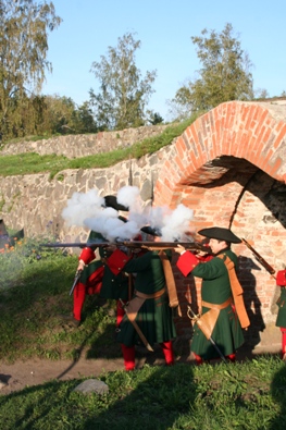 взят русскими войсками. В выезде приняли участие преображенцы из Санкт-Петербурга и Нарвы, питерские новобранцы и наши друзья из Москвы. Мы традиционно занимались экзерцициями; за ними наблюдали местные жители и туристы, которым мы охотно рассказывали, кто мы такие и что тут делаем. Из новых "фишек" той эпохи, в этот раз мы отработали метод ведения огня в узком пространстве ворот, а также различные методы стрельбы из-за парапета крепостной стены ( сожалению, эта часть учений осталась незапечатленной). Из забавного: нам было позволено развести костер для варки каши прямо на территории крепости. Дым из-за стен заметили местные жители и в какой-то момент у нас на крепостной стене появились пожарные, забравшиеся туда по приставной лестнице. За доблестный (и, слава богу, бесполезный) штурм наши кашевары с удовольствием угостили приозерских огнеборцев кашей и напитками :)