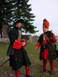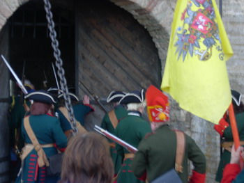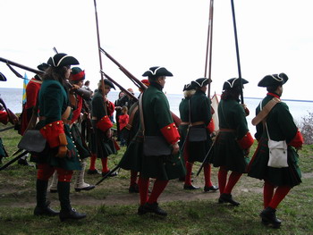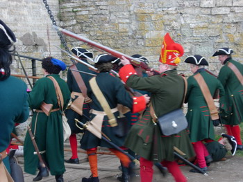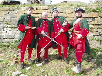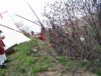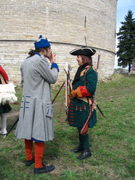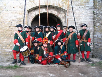 *** О том, что такое крепость Орешек и как мы появились в ней первый раз, читайте наш отчет от октября 2004 г. Фестиваль задумывался как открытие сезона "петровской" реконструкции. На него приехали клубы из Санкт-Петербурга (Л-Гв.Преображенский полк, гренадерский полк дю Буа, Великолукский полк), Нарвы (2-ая рота Преображенского полка), Петрозаводска (Олонецкий пехотных) и Смоленска (Смоленский пехотный). К сожалению, не все удалось так, как хотелось бы - в первую очередь потому, что вместо двух дней нам в крепости было отведено лишь полдня. Администрация музея не одобрила нашего желания поселиться на их острове на два дня, к тому же Правительство РФ в последний момент перенесло нерабочие дни и выходным осталось лишь воскресенье 15 мая. Исторический парусник "Св.Николай" пришел уже вечером, когда мы сворачивали лагерь, и не смог поучаствовать в акции. Тем не менее, нам удалось провести "экзерциции": ружейные приемы отрабатывались по т.н. уставу А.Вейде 1698, а строевые эволюции - по "Краткому обыкновенному учению" 1702 года. В частности, эффектно смотрелось сдваивание шеренг для стрельбы, когда шестишереножный строй с большими интервалами превращался в плотный трехшереножный строй, готовый к пальбе залпом. Конечно, нам еще предстоит много тренироваться, прежде чем мы начнем напоминать вышколенную пехоту Петра под Полтавой. Затем было проведено два боя - атака укрепленного лагеря и штурм крепостных ворот. По окончании боевых действий, в лагере были приготовлены каша и сбитень. Итоги: Огромное спасибо всем, кто приехал издалека даже на один день! Нас собралось 20 человек - уже неплохое количество солдат для реконструкции линейного строя. Ну и наконец - все участники поняли, что нам нужно как можно больше "учиться военному делу 18-го века настоящим образом" :)