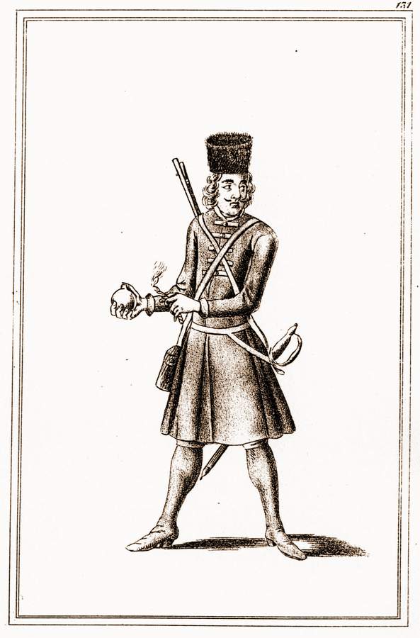 Будеже кто спросит, неумеютли Гранадиры еще того боле дела, как выше помянуто, тому даю я вответ; что им особно воучении согранатом фузеею, и багинетом, боле ведати ненадобно, как им есть прежде указано, междотемже могут оные вразных прилучаех более употреблены быть, якоже имянно напрниступах, набоях, також егда подкопы взрывать хощешь, дабы сними наместе устоять и укрепится, сие все надлжеит, и чинится чрез разумное наставление полковничье, усаксонцев надлежит Гранадирам, егда силнаго неприятеля чают рогатки несть.