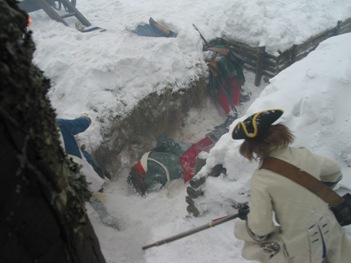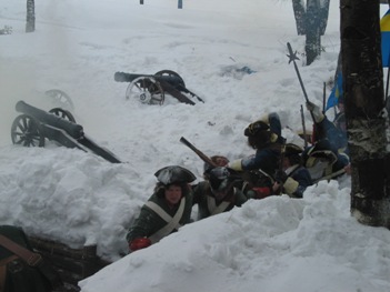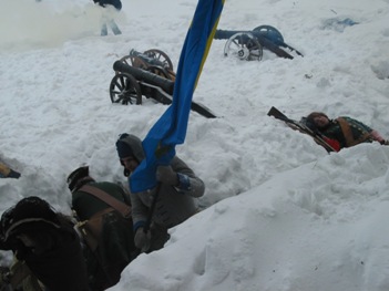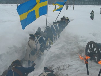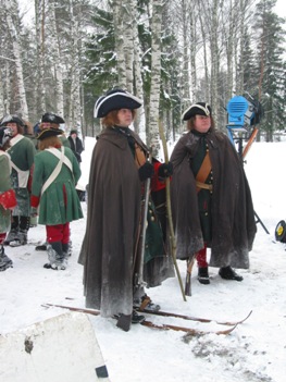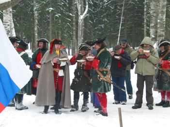 *** Во время съемок ни одно животное не пострадало, если не считать сильно замерзших нас... Очередные эпизоды фильма о Петре Первом от канала National Geographic (прошлой осенью мы уже снимались в качестве победителей при Полтаве и строителей Петербурга); на этот раз снимались эпизоды из начала Северной войны, где русским солдатам досталось нелегко - поражение под Нарвой в 1700 году. Наши мундиры, конечно же не соответствовали изображаемому периоду лет на 8, но странные одежды всей остальной массовки и удивительные взгляды авторов фильма на быт и тактику изображаемой эпохи нас уже не расстраивали, мы с этим смирились. Как реконструкторы, имеющие отношение к эпохе, мы смогли лишь продемонстрировать для камеры исторически достоверные учения с ружейными приемами в одной из сцен. В остальном, мы бродили по сугробам пешком и на лыжах, принимали смерть от рук "шведов", валялись трупами на снегу и покрывались нарисованными травмами на биваке после неудачного боя. В целом, получившиеся эпизоды должны наглядно показать зрителям, какие лишения и потери пришлось перенести Петру и русской армии, чтобы добиться в итоге победы в Северной войне. Интересно будет посмотреть на результат - возможно серия будет готова к сентябрю 2006 г.