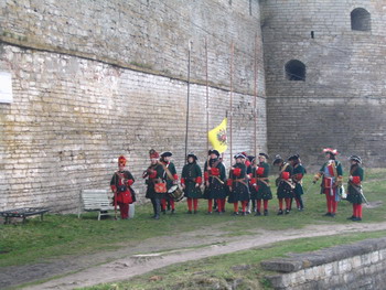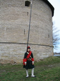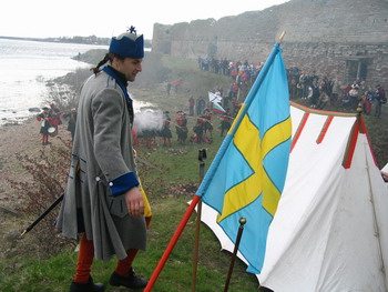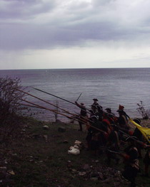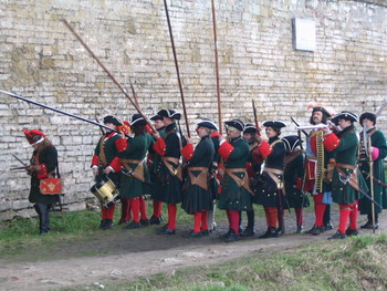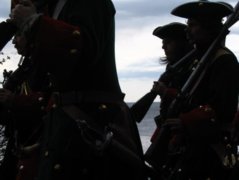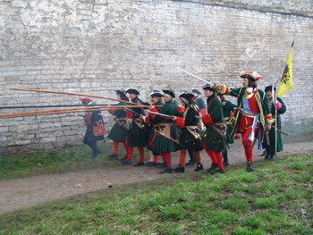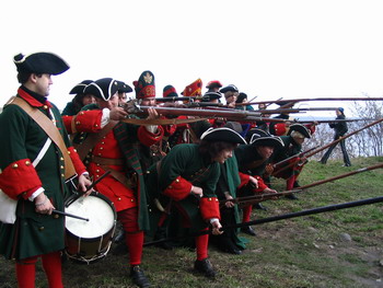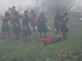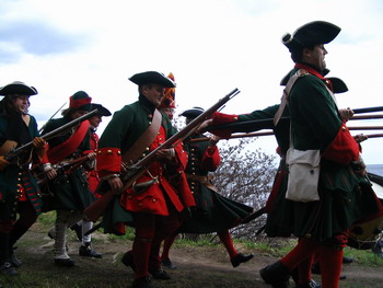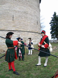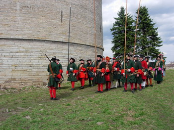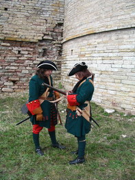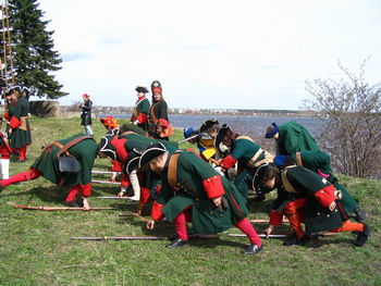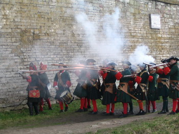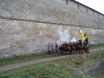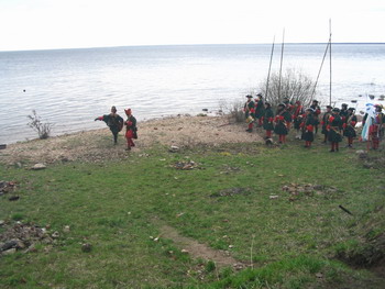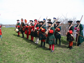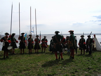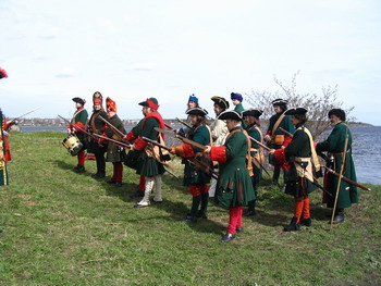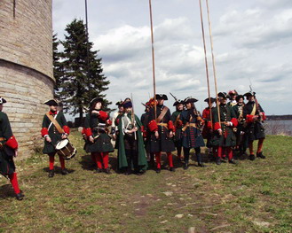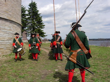 *** О том, что такое крепость Орешек и как мы появились в ней первый раз, читайте наш отчет от октября 2004 г. Фестиваль задумывался как открытие сезона "петровской" реконструкции. На него приехали клубы из Санкт-Петербурга (Л-Гв.Преображенский полк, гренадерский полк дю Буа, Великолукский полк), Нарвы (2-ая рота Преображенского полка), Петрозаводска (Олонецкий пехотных) и Смоленска (Смоленский пехотный). К сожалению, не все удалось так, как хотелось бы - в первую очередь потому, что вместо двух дней нам в крепости было отведено лишь полдня. Администрация музея не одобрила нашего желания поселиться на их острове на два дня, к тому же Правительство РФ в последний момент перенесло нерабочие дни и выходным осталось лишь воскресенье 15 мая. Исторический парусник "Св.Николай" пришел уже вечером, когда мы сворачивали лагерь, и не смог поучаствовать в акции. Тем не менее, нам удалось провести "экзерциции": ружейные приемы отрабатывались по т.н. уставу А.Вейде 1698, а строевые эволюции - по "Краткому обыкновенному учению" 1702 года. В частности, эффектно смотрелось сдваивание шеренг для стрельбы, когда шестишереножный строй с большими интервалами превращался в плотный трехшереножный строй, готовый к пальбе залпом. Конечно, нам еще предстоит много тренироваться, прежде чем мы начнем напоминать вышколенную пехоту Петра под Полтавой. Затем было проведено два боя - атака укрепленного лагеря и штурм крепостных ворот. По окончании боевых действий, в лагере были приготовлены каша и сбитень. Итоги: Огромное спасибо всем, кто приехал издалека даже на один день! Нас собралось 20 человек - уже неплохое количество солдат для реконструкции линейного строя. Ну и наконец - все участники поняли, что нам нужно как можно больше "учиться военному делу 18-го века настоящим образом" :)
