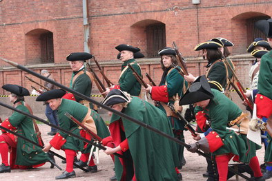 *** Фестиваль проводился Военно-исторической Ассоциацией Санкт-Петербурга на территории ВИМАИВ и ВС (Артиллерийского музея). За два дня зрители, которых , к сожалению, оказалось не так много, могли наблюдать выступления римских легионеров, воинов Средневековья, солдат наполеоновских войн, северян и южан США, а также солдат обеих мировых войн. Все эти эпохи реконструируются сравнительно давно в России и в мире. "Петровские" клубы впервые выступили наравне с другими эпохами на таком общем фестивале. Мы сразу решили, что изображать "войну" смысла не имеет – делить двадцать человек пополам и воевать – выглядит довольно нелепо и неисторично. Поэтому было решено совместить приятное с полезным – построить капральство в масштабе 1:1, заняться учениями по уставу 1700 года и явить это публике в качестве занимательного зрелища с грамотным комментарием. Построили правильный 6-шереножный строй; стреляли падением шеренг; сдваивали шеренги палили залпом; (не по уставу) стреляли стрешным ходом; отражали атаки кавалерии; атаковали с багинетами, а также с багинетами и шпагами, по-шведски. Перестроения и залповая пальба из кремневых мушкетов были чертовски хороши! Участвовали преображенцы из Петербурга и Нарвы, драгуны из Москвы (кстати, впервые продемонстрировавшие драгунскую амуницию), Великолукский полк (СПб), Олонецкий полк (Петрозаводск) и примкнувшие одиночки разных цветов. В качестве кавалерии выступали французские драгуны. Кавалерия была нужна нам, чтобы показать отражение кав.атаки, проиллюстрировать применение пик и штыков, что и удалось вполне.