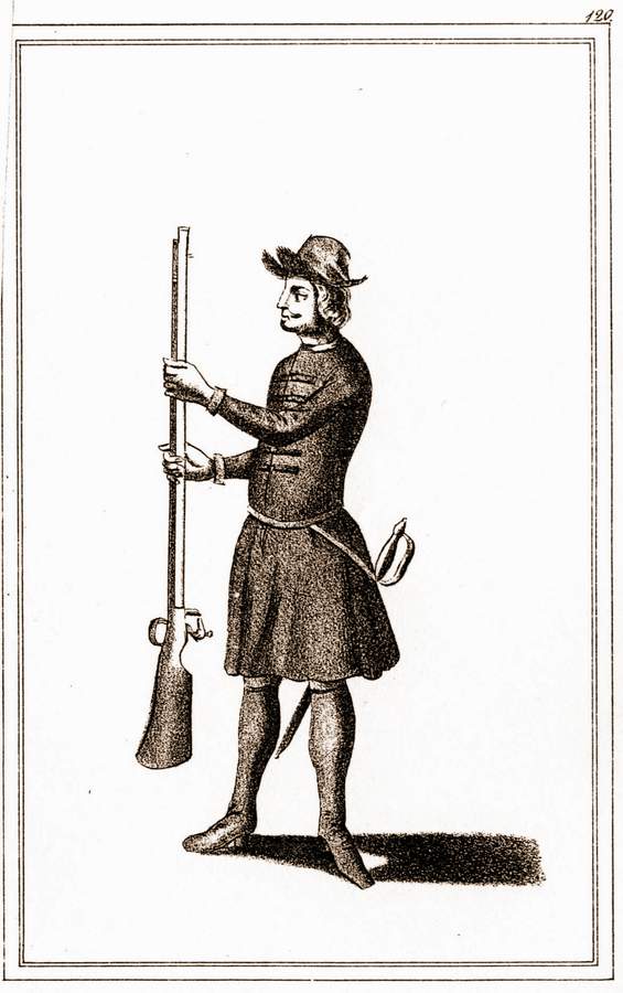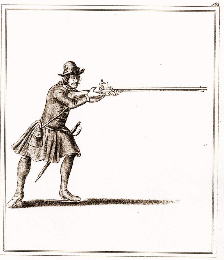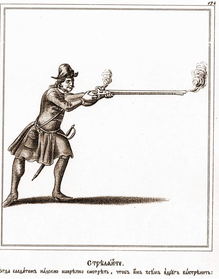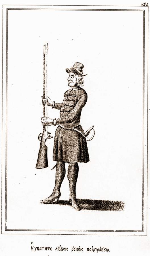 Можетъ единъ кто нибудъ обрестися, который молвитъ, что недобро такъ много излишныхъ словъ: кнарежанiю ружъя употребляти, и азъ такожъ Говорю, что cie правда есть, и ненадобнобъ ктому более кроме того. что однимъ токмо словомъ сказать, зарежайте мушкеты и будте готовы, но подобаетъ сперва втомъ салдатовъ научить, какъ имъ прямо на единъ образецъ исполнять, инакоже азъ свободно скажу, что егда полкъ, которой неоснователно взарежанiи наученъ, и имъ единымъ словомъ молвить, зарежайте ружъе, и будте Готовы, то увиделъ бы, всякъ какъ единый тише, нежели другiй cie чинить сталъ, и какоебъ безстройство еще кроме того учинилось, то можетъ кажды, илехко подумать, и едвабъ невсякiй салдатъ свою особливую установку притомъ учинилъ. Первой бы направо, иной налево, третей поперегъ, и тако, чтобъ толко единое смятенiе изъ того произошло, но когда салдаты ухватки кнарежанiю основателно, и на единъ образецъ выучили, и тогда пространства, и излишныхъ словъ уже непотребно но молвитъ токмо имъ. 1. Зарежайте ружъе. и будте Готовы. 2. Прикладывайтеся. 3. Стреляйте Однакож подобаетъ ухватки всегда на единой образец чинить, якоже имъ указано есть, чтоб нетокмо едино пригоже, но и порядочно исполнено было. | |||||||||||||||||||||||||||||
