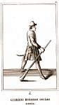 На переднем плане спиной стоит солдат в шляпе. Мушкет на левом плече, перевязь патронной сумы через левое плечо, с пряжкой непонятной формы посередине спины, поверх поясной портупеи. |