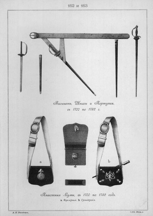 "Вооруженіе и амуницію армейскихъ и гарнизонныхъ войскъ, согласно табели 9 Февраля 1720 года, составляли: