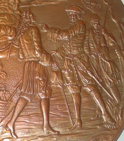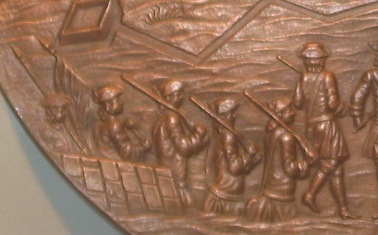 На заднем плане в лодках сидят солдаты в шляпах с перевязями через левое плечо, пряжек не видно. На переднем плане гренадер с сумами на левом и правом боках. На перевязях спереди пряжки - прямоугольные с одним шпеньком. Сума с жестким коробом и мягкой крышкой. |