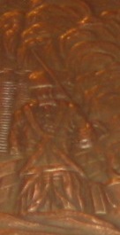 На переднем плане спиной стоит солдат в шляпе. Перевязь патронной сумы на спине имеет пряжку - симметричную из двух лепестков, и запряжник, свободный конец перевязи закруглен/заострен.